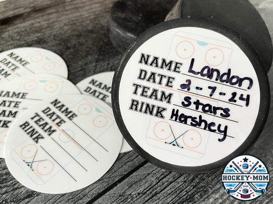 Our hockey puck stickers are the perfect way to celebrate special hockey game achievements and milestones such as shutouts, hat tricks, 1st goals and playmakers! Add your own puck (either a game puck or a new puck) and create an awesome looking display piece. Record important details on the back sticker.