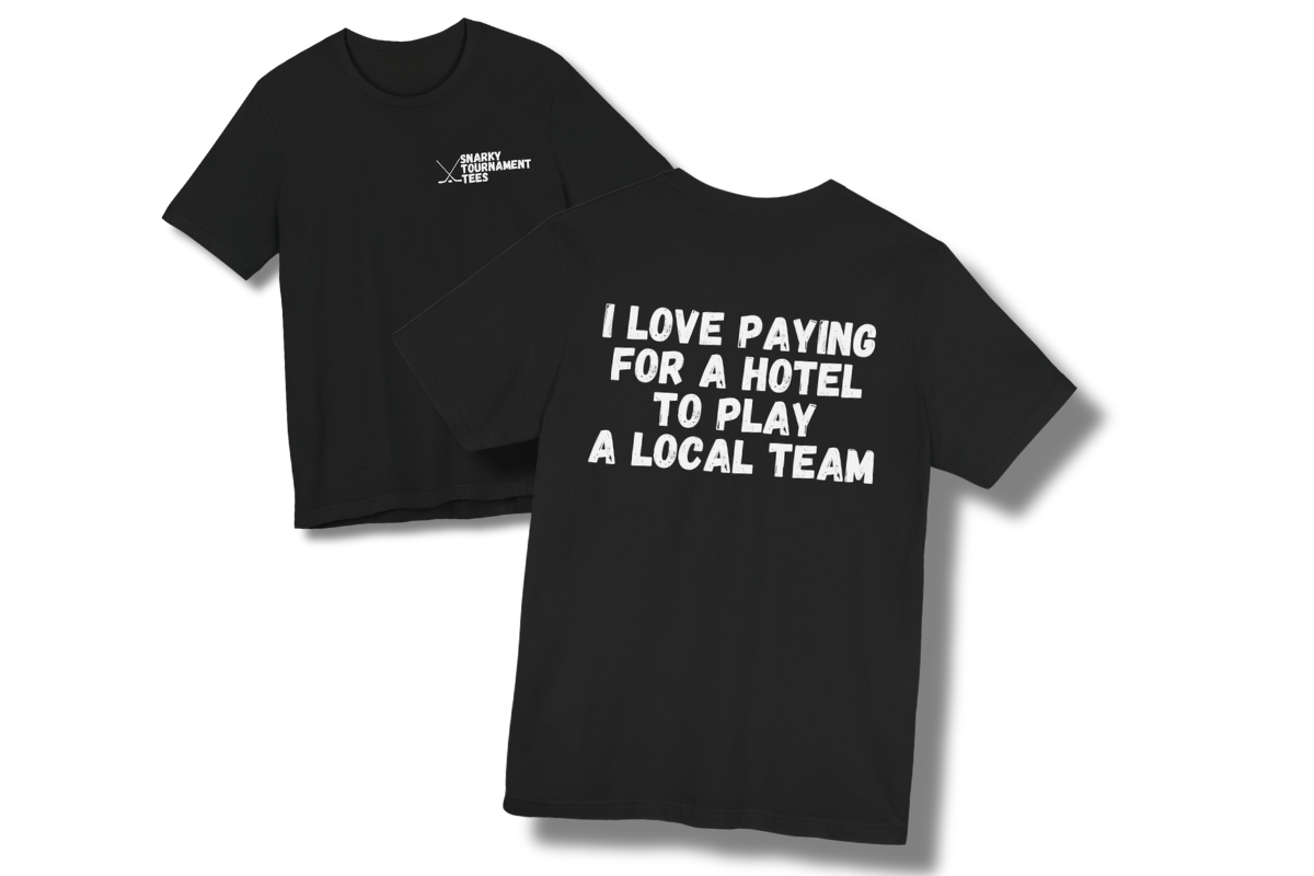 This tee perfectly captures the irony of tournament weekends that require hotels… to play teams from down the road. Designed for parents who laugh about it now because the reservation is already paid.
